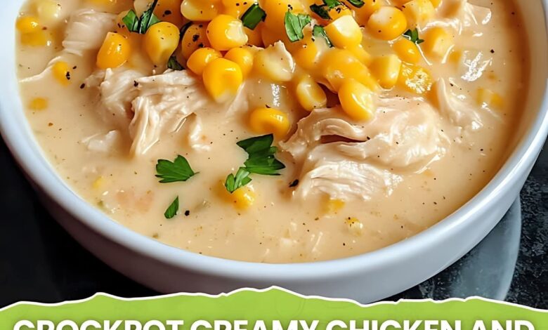 This slow-cooked creamy chicken and corn chowder is a hearty blend of tender shredded chicken,